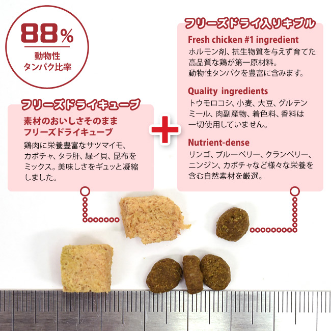 フリーズドライ入りキブルとフリーズドライキューブをミックス。フリーズドライの素材そのままのおいしさを加えました。