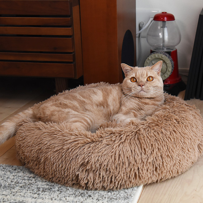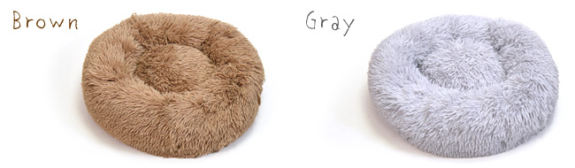 長めのファーがモコモコで、ふんわりボリュームがあり、思わず丸くなって寝たくなるペット用ベッド。
