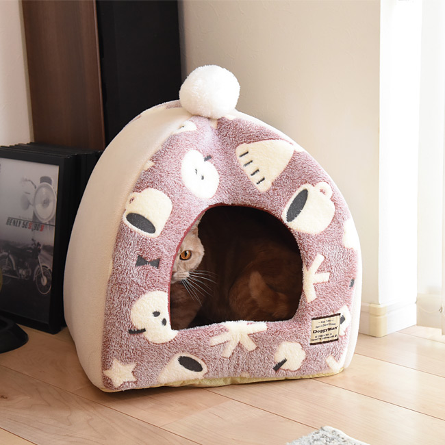ポンポンが可愛い!柔らかい触り心地のペット用ドーム型ベッド。ドギーマン あったかプラス ぽんぽんベッド M ふゆじかん 犬猫用 ペット用 秋冬ベッド 洗える