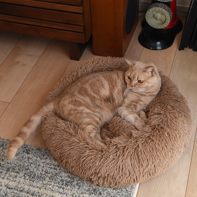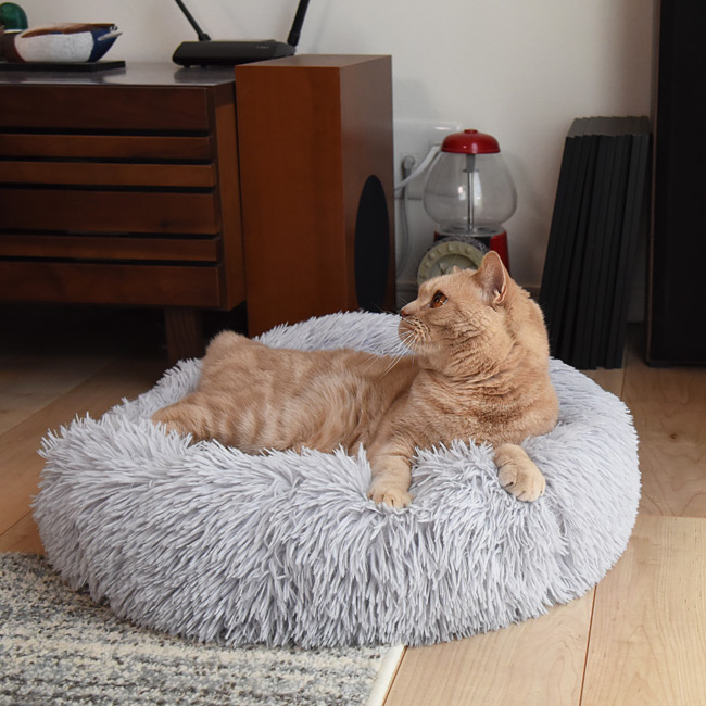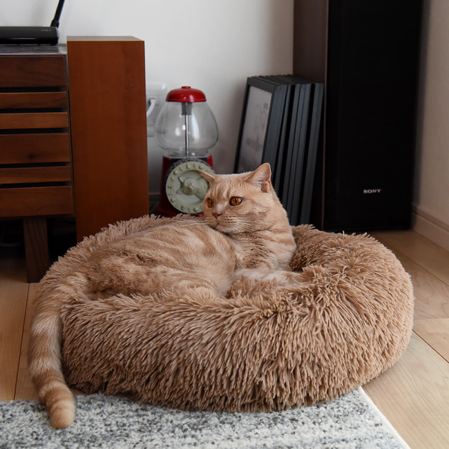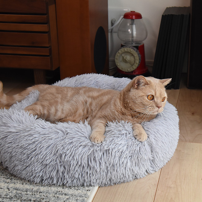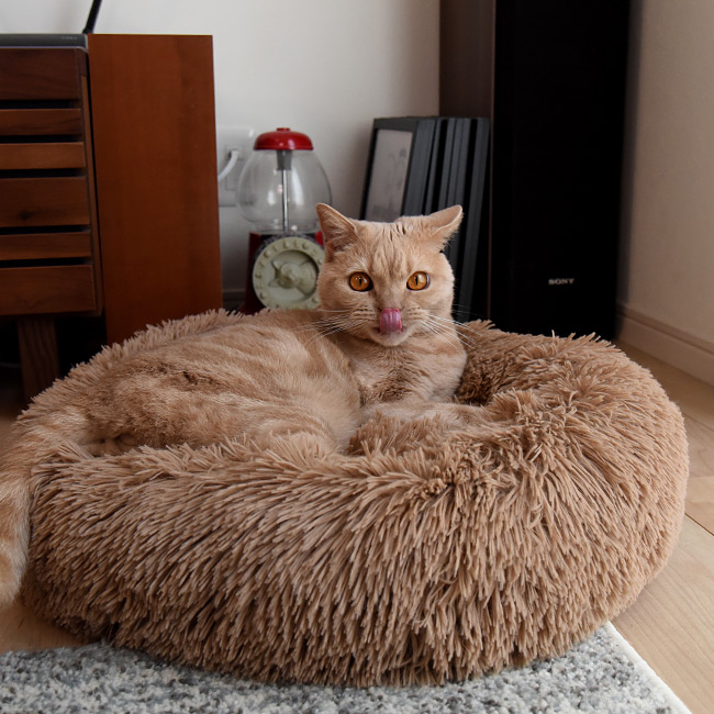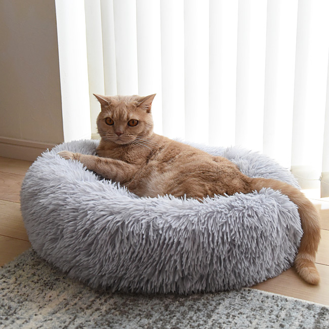 長めのファーがモコモコで、ふんわりボリュームがあり、思わず丸くなって寝たくなるペット用ベッド。