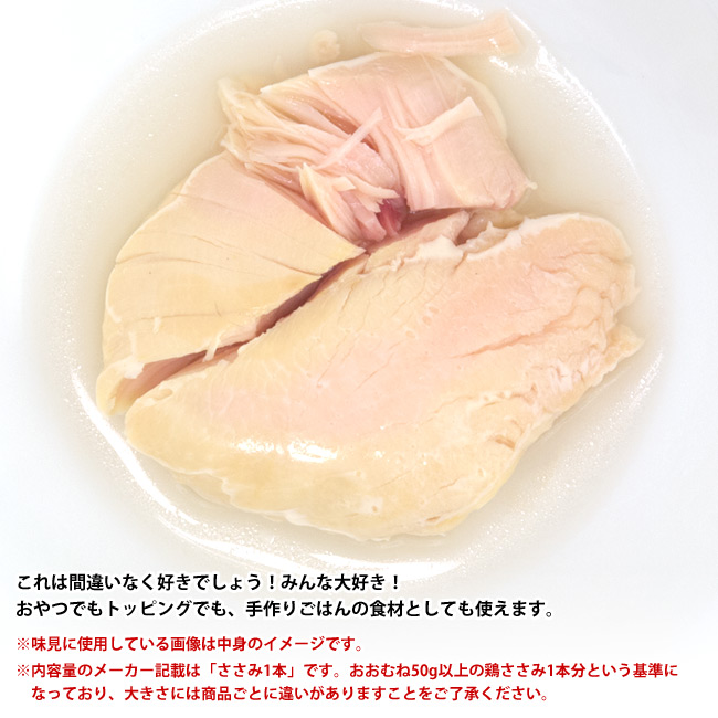 Lサイズ鶏ささみ1本(50g以上) ※内容量のメーカー記載は「ささみ1本」です。おおむね50g以上の鶏ささみ1本分という基準になっており、大きさには商品ごとに違いがありますことをご了承ください。 |