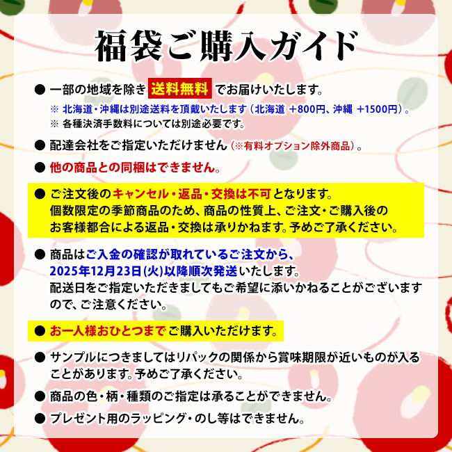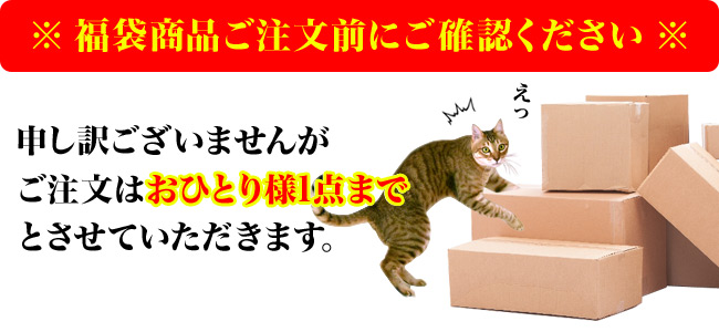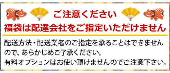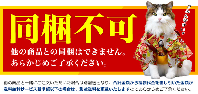 他の商品と一緒にご注文いただいた場合は別配送となり、合計金額から福袋代金を差し引いた金額が送料無料サービス基準額以下の場合は、別途送料を頂戴いたしますのであらかじめご了承ください。
