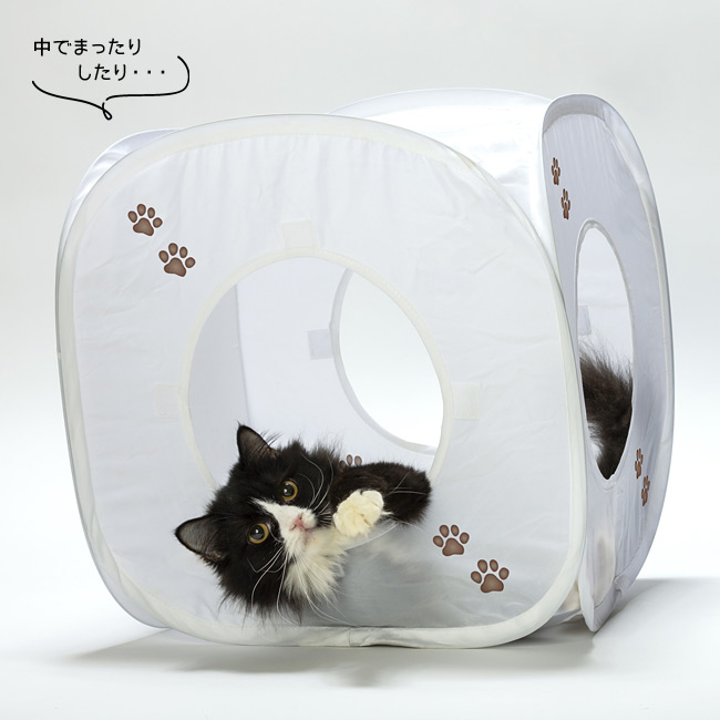 さらに、キューブ内側の天井には、猫ちゃんの遊び心をくすぐる布製のひらひらのおもちゃがついているから、キューブの中で猫がひとり遊びを楽しむこともできますよ。