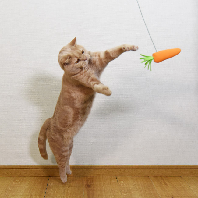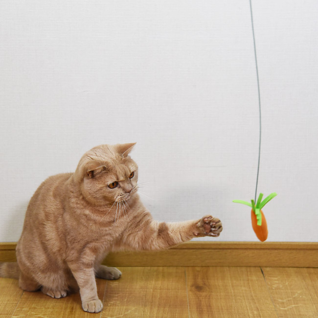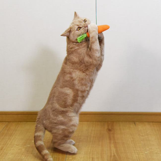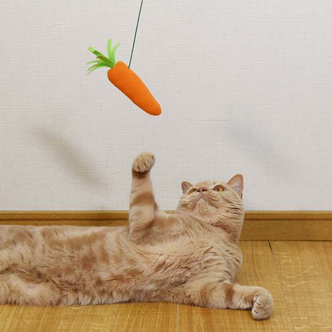 野菜モチーフなので、じゃらしで遊んでいると、ネコちゃんが人参にかぶりついているみたい!