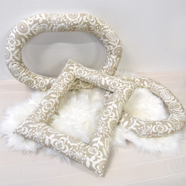 ナチュラルテイストの花柄が可愛い、北欧調の雰囲気のある生地でお作りした縁どりベッド。