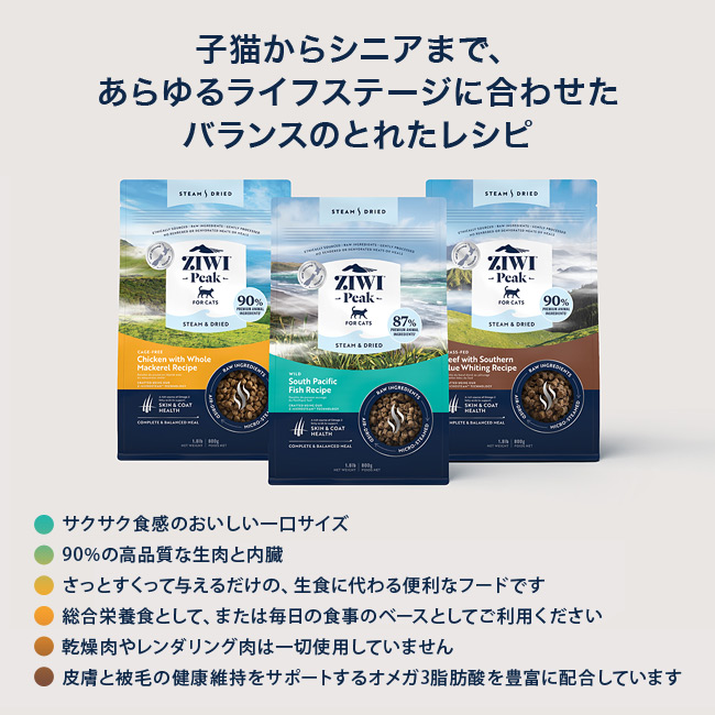ジウィピーク スチームドライ ケージフリーチキン with 丸ごとマッカロー レシピ 800g (10062) ZIWI Peak ドライフード 全年齢猫用 総合栄養食