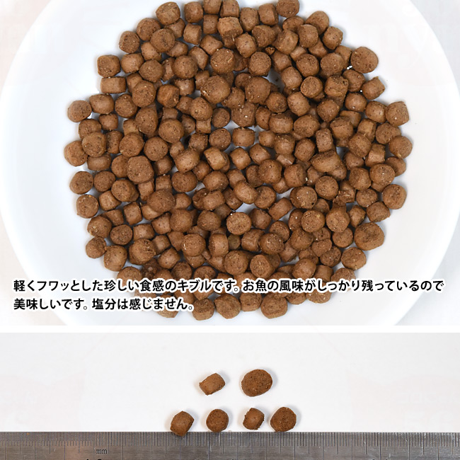 ニュージーランド周辺の豊かな海からサステナブルな方法で調達された天然の丸ごと真アジ、丸ごとサザン・ブルー・ホワイティング、丸ごとイワシ、丸ごとマッカロー(サバ)、ホキを使用して作られています。健康な皮膚と被毛の健康維持をサポートするオメガ3脂肪酸を多く含んでいます。