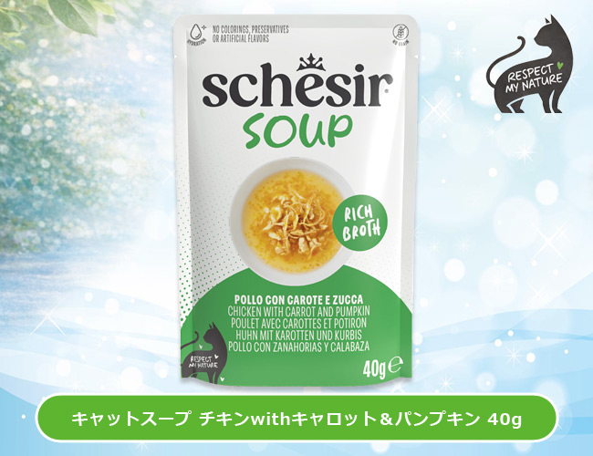 美味しく水分補給ができるスープタイプ。【発売記念10%OFF】シシア キャット スープ チキンwithキャロット&パンプキン 40gパウチ (21254058) Schesir 猫用 ウェットフード 水分補給【ポイント10倍】