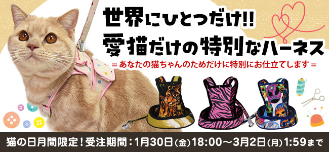 猫の日月間限定のスペシャルな企画となっておりますので、ぜひこの機会にあなたの猫ちゃんだけの特別なハーネスをお作り下さいませ♪