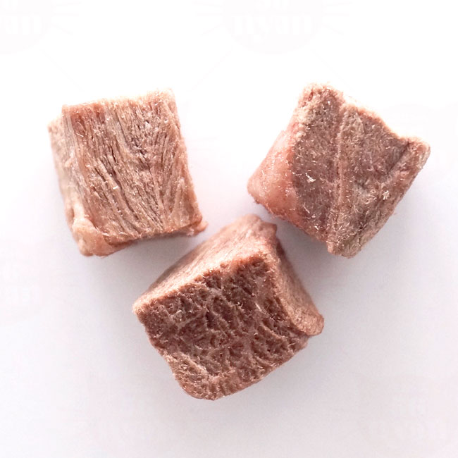 そのままでもサクサクとおいしいおやつですが、お湯で戻すと茹でたての牛肉に負けない香りと食感に! 噛む力が弱いシニア猫や子猫にもオススメです。
