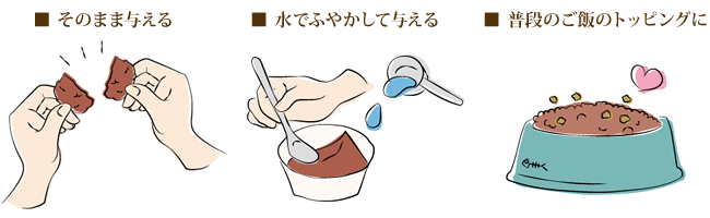 水を加えると、生肉にもどるため、肉食獣の犬・猫に自然なお食事。水でもどすことで、水分を自然に食事から摂取することもできる。