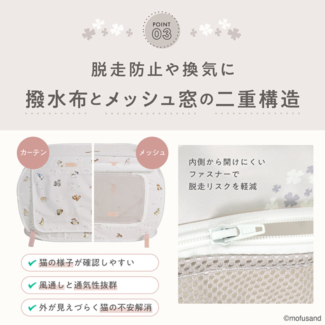 換気をしたい時はメッシュに、落ち着かせたい時は布を閉じるなど使い分けができ、内側から開けにくいファスナーで脱走リスクを軽減します。