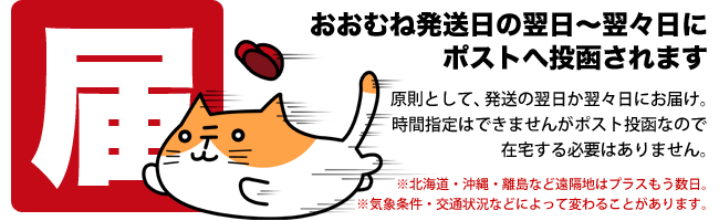 郵便受けへのお届けとなりますので、配送日時のご指定は出来ません。