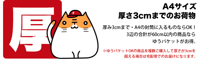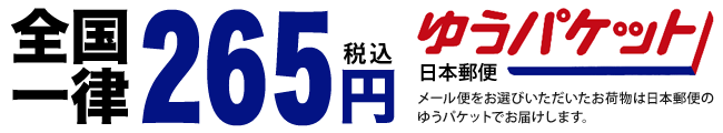 対応商品には「ゆうパケットOK」マークが付いておりますので、マークの付いていない・NGマークがついている商品はゆうパケット対応不可とお考え下さいませ。