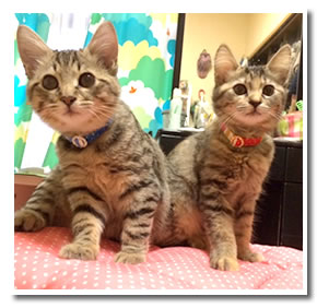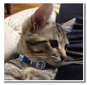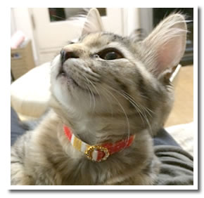 そうですね、一緒に生まれたほかの兄弟に比べて、 真愛は首輪とかつけるのも全く抵抗がありませんね。 これも女の子だからかな…と父と話しています。 性格はパパの真洋、ルックスはもろママのメグミちゃん似。 パパは黒猫ちゃんなので。